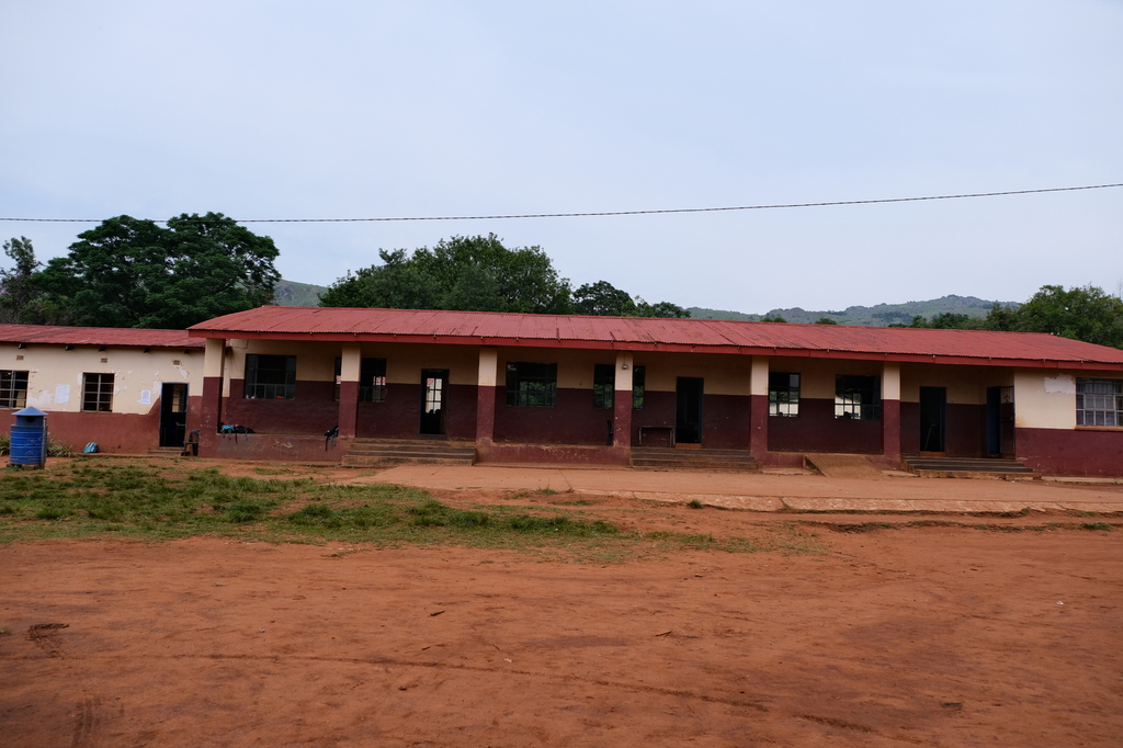 Visite d'une école primaire : chants des enfants, explications des enseignants et remises de fournitures scolaires et denrées alimentaires.